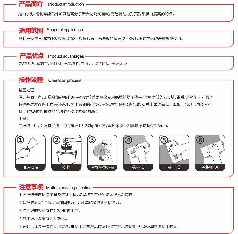 是由水泥,精制碳酸鈣外加其他高分子聚合物配制而成。有易批刮,好打離,細膩白度高的特點。