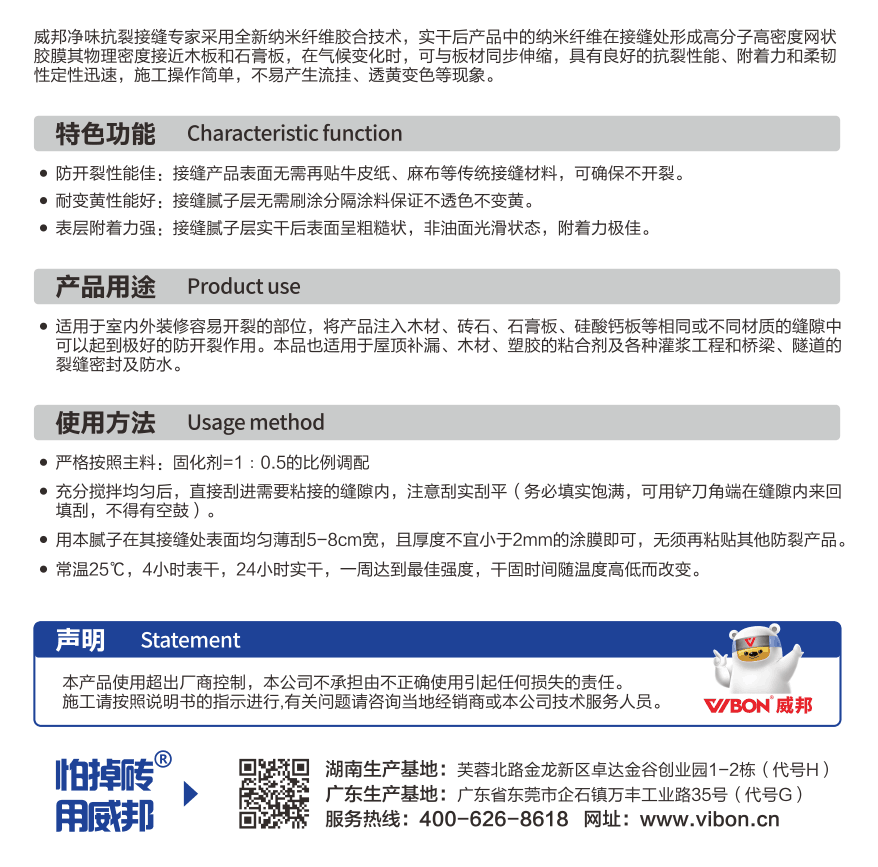 威邦凈味抗裂接縫專家采用全新納米纖維膠合技術,實干后產品中的納米纖維在接縫處形成高分子高密度網狀膠膜其物理密度接近木板和石膏板,在氣候變化時,可與板材同步伸縮,具有良好的抗裂性能、附著力和柔韌性定性迅速,施工操作簡單,不易產生流掛、透黃變色等現象。