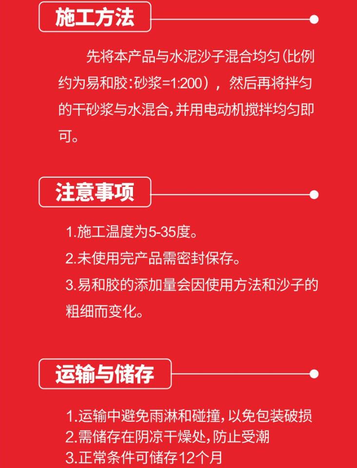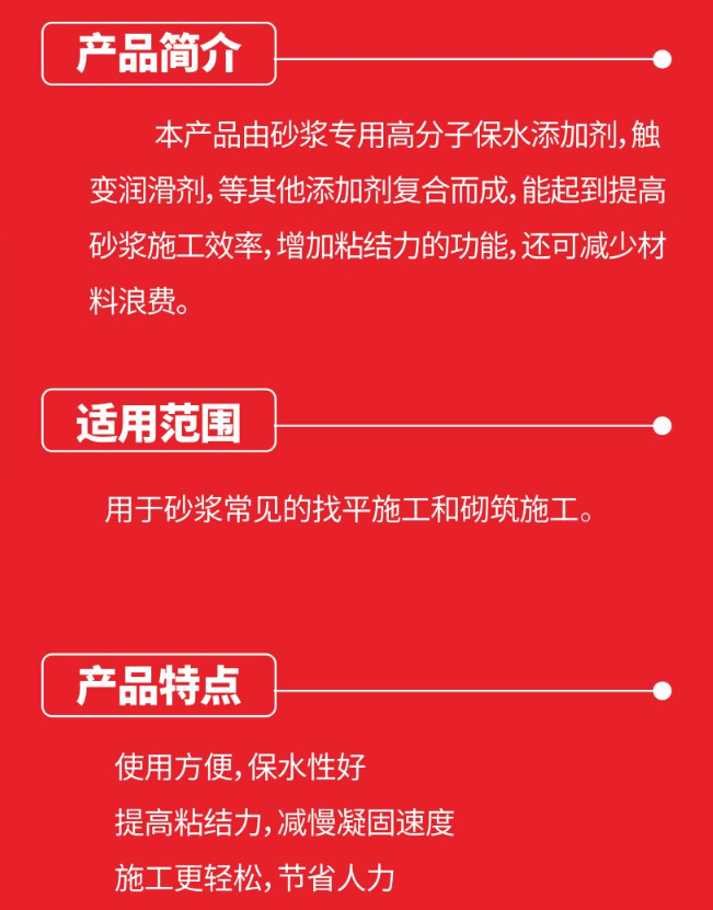 本產品由砂漿專用高分子保水添加劑,觸變潤滑劑,等其他添加劑復合而成,能起到提高砂漿施I效率,增加粘結力的功能,還可減少材料浪費。