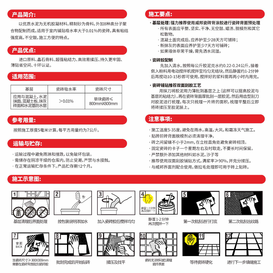 合物配制而成。適用于室內鋪貼吸水率大于0.01%的瓷磚,具有粘結
